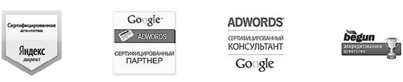 За последние годы свидетельство об аттестации получили несколько тысяч человек. Необходимо подчеркнуть, что персональный сертификат ничего не говорит о практическом опыте его владельца. Наличие такого опыта специалист должен подтвердить с помощью документированного портфолио: списка авторитетных клиентов с контактными телефонами, по которым можно проверить информацию, а также отзывов, благодарностей, рекомендаций. Намного серьезнее рекламные сервисы подходят к вопросу о подтверждении потенциальным клиентам квалификации рекламных агентств. Обязательными элементами сертификации агентства являются: • наличие в штате агентства не одного, а нескольких сертифицированных специалистов, их минимальное необходимое количество зависит от количества клиентов агентства; • соответствие метрическим показателям качества работы. К метрическим показателям относятся: • активность клиентской базы агентства (величина оборота за определенный период времени); • эффективность проводимых рекламных кампаний; • качество подготовки рекламных материалов; • полнота использования инструментов, предлагаемых рекламным сервисом. Выполнить требования для аттестации агентств без длительной профессиональной практики невозможно. Является ли рекламное агентство сертифицированным в настоящий момент, легко проверить на сайтах Яндекс.Директа, Google AdWords и «Бегуна» (см. адреса в «Полезных ссылках» к данной главе). Все три сервиса поддерживают актуальность этих списков. Полный набор символики о высшей квалификации рекламного агентства приведен на рис. 13.
