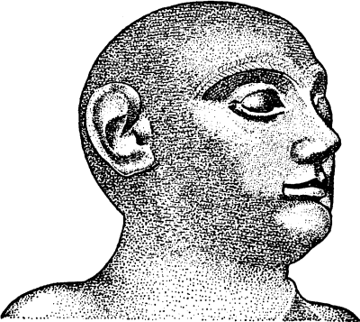 Рис. 20 Шумерские скульпторы оставили после себя записи в камне, которые могут дать нам свидетельство о черепах. Эти записи состоят из барельефов определенного типа, и некоторые из них – это действительно прекрасные портреты без прикрас. Эти рельефы показывают жилистых, атлетических мужчин с большими, зачастую орлиными носами. Очевидно, что это обычные европеоиды какой‑то ближневосточной разновидности. Кажется, что портретные бюсты, из которых продемонстрированы три примера (рис. 17, 18 и 19), реально отображают отдельных людей, а не условные типы или идеалы. Рисунок 18 представляет часто изображаемого на скульптурах царя Гудея, у которого кругловатое лицо и нос, менее выступающий, чем барельефный идеал.