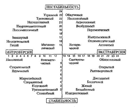 Чтобы определить тип темперамента, необходимо полученные ответы сверить с «ключом». «Ключ»: 1. Шкала экстраверсии — интроверсии: начислите по 1 баллу за каждое совпадение: «да» — 1, 3, 8, 10, 13, 17, 22, 25, 27, 39, 44, 46, 49, 53, 56; «нет» - 5, 15, 20, 29, 32, 34, 37, 41, 51. Интроверсия: 0—12 баллов. Экстраверсия: 13—24 балла. 2. Шкала эмоциональной стабильности — эмоциональной нестабильности: начислите по одному баллу за каждое совпадение: «да» на вопросы 2, 4, 7, 9, 11, 14, 16, 19, 21, 23, 26, 28, 31, 33, 35, 38, 40, 43, 45, 47, 50, 52, 55, 57. Эмоциональная стабильность (устойчивость): 0—12 баллов; Эмоциональная нестабильность (неустойчивость): 13—24 балла. 3. Уровень вашей искренности: начислите по 1 баллу за каждое совпадение: «да» — 6, 24, 36; «нет» — 12, 18, 30, 42, 48, 54. Если совпадений меньше четырех, результат тестирования достоверный. Экстравертам свойственна общительность, импульсивность, прямолинейность в суждениях, ориентация на внешнюю оценку. Интровертам присущи необщительность, закрытость, склонность к самоанализу, осторожность. Эмоционально-устойчивые люди не склонны к беспокойству, устойчивы к внешним воздействиям. Эмоционально-нестабильные — чувствительны, тревожны, эмоциональны, склонны расстраиваться по мелочам. Полученные в результате обработки данные отразите в «Круге Айзенка»