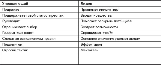 Граница между управлением и лидерством условна в педагогической деятельности, но она есть. Посмотрите внимательно таблицу. Достаточно ли названо различий? Если считаете нужным – продолжите список.