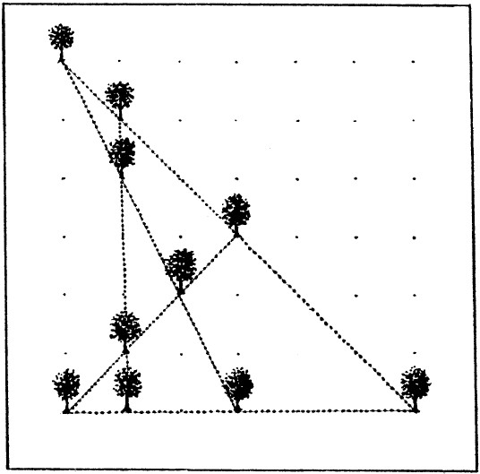 8. Деревья, оставшиеся несрубленными, расположены так, как показано на рис. 16. Как видите, они действительно образуют 5 прямых рядов, и в каждом ряду 4 дерева.