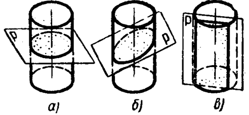 Построение линии пересечения поверхности вращения плоскостью начинают с определения её опорных точек. Опорными называют высшую и низшую точки относительно плоскости Н, крайние левую и правую, переднюю и заднюю, а также точки видимости, расположенные на контурных линиях и делящие линию пересечения на видимую и невидимую части. Остальные точки являются промежуточными. Для построения точек линии пересечения используют вспомогательные плоскости, перпендикулярные оси вращения. Линейчатые поверхности пересекают вспомогательными плоскостями также по прямым линиям. Сечение цилиндра. Любая плоскость пересекает поверхность прямого кругового цилиндра: 1) по окружности, если плоскость перпендикулярна оси цилиндра (рис.34, а) 2) по эллипсу, если плоскость произвольно наклонена к оси цилиндра (рис.34, б) 3) по двум образующим, если плоскость параллельна оси цилиндра и отстаёт от неё на расстояние, которое меньше радиуса цилиндра (рис.34, в) 4) по одной образующей, если плоскость параллельна оси цилиндра и отстоит от неё на расстояние, которое равно радиусу цилиндра (плоскость – касательная к поверхности цилиндра).