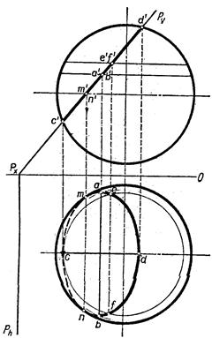 Рисунок 35 Сечение шара. Любая плоскость пересекает поверхность шара по окружности. В зависимости от положения секущей плоскости проекцией фигуры сечения шара может быть круг, прямая или эллипс. На рисунке 36 показано построение проекций линии пересечения поверхности шара фронтально-проецирующей плоскостью Р. фронтальная проекция линии пересечения представляет собой отрезок а/b/ на фронтальном следе плоскости, а горизонтальная – эллипс, который строят по точкам, определяемым с помощью горизонтальных плоскостей уровня S1, S2, S3.