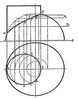 Вводим вспомогательную плоскость R, параллельную плоскости Н; плоскость R пересекает обе поверхности по окружностям; на их пересечении находим точки (1, 1/ ) и (2, 2/). Аналогично находим еще ряд произвольных точек. Затем – характерные точки: низшую (a, a/), высшую (b, b /), а также (а, а/) и (b, b/). Соединив все наеденные точки кривой линией, получаем искомую линию пересечения. Способ концентрических секущих сфер. Если оси двух поверхностей вращения взаимно пересекаются и параллельны какой-либо плоскости проекций, то для построения линии их пересечения применяют вспомогательные сферы. Построение основано на том, что сфера, центр которой расположен в точке пересечения осевых линий поверхностей вращения, пересекается с ними по окружности. Проекция линии пересечения на плоскости, параллельно которой расположены оси, может быть построена по одной проекции этих поверхностей. Алгоритм: 1) проводим секущую сферу; 3) строим линии пересечения сферы с каждой из поверхности; 4) на пересечении построенных линий находим искомую точку. Проводим ещё ряд сфер и находим точки, принадлежащие линии пересечения, которые соединяем между собой плавной кривой линией. Необходимо провести сферу с минимальным и максимальным радиусом. Этот радиус выбирается так, чтобы данная сфера только касалась одной из поверхностей и в тоже время пересекала другую. ПРИМЕР. Построить линию пересечения цилиндра с конусом, пользуясь шаровыми поверхностями (рис. 39). Принимаем точку (с, с/) пересечения осе цилиндра и конуса за центр вспомогательных шаровых поверхностей. Описываем из точки (с, с/) шар произвольного радиуса, который пересекает каждую из данных поверхностей по окружности; вертикальные их проекции – прямые линии, а горизонтальные – эллипсы (последние для решения задачи не нужны и поэтому их не строим). На пересечении этих прямых линий получаем вертикальные проекции 1/ и 2 / точек. Аналогично, меняя только радиус шара, получаем еще ряд точек. Соединив эти точки кривой линией находим искомую линию пересечения.