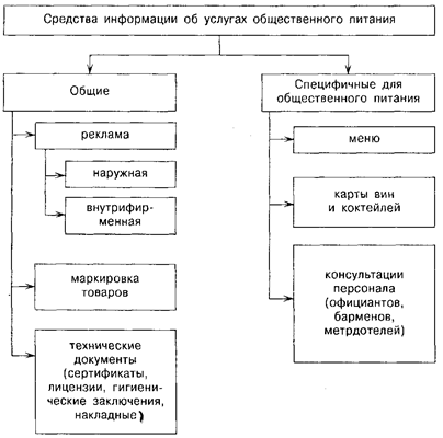 Информационное обеспечение процесса обслуживания Лекция 4 Средства информации — средства, направленные на доведение до потребителя сведений о фирменном наименовании предприятия, его месторасположении, типе и классе предприятия, его специализации, режиме работы, оказываемых услугах, кулинарной продукции и готовых товарах, реализуемых потребителям при оказании услуг (рис. 3). Средства информации преследуют следующие цели: предоставление перечня предлагаемых потребителям блюд, напитков и дополнительных услуг общественного питания, выражение общей идеи (концепции) ресторана, полную реализацию всех его возможностей. Учитывая, что общие средства информации (реклама, маркировка и др.) подробно рассматриваются в других дисциплинах (Маркетинг, Товароведение и т. п.), в настоящем учебнике остановимся лишь на вывесках предприятий общественного питания и специфических средствах. Вывески являются важным носителем рекламы. К наружным средствам рекламы относятся также витрины, различные рекламно-информационные стенды и панно. В художественном оформлении этих средств информации крупно выделяют основные элементы фирменной символики (знак обслуживания, фирменный блок, фирменные цвета). Фирменная вывеска, витрины и панно, расположенные на внешнем фасаде здания ресторана, форменная одежда обслуживающего персонала — составные элементы фирменного стиля, создающего имидж (представление, образ) предприятия для потребителей.