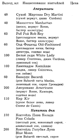 Карта коктейлей ресторана начинается с коктейлей-аперитивов, открывающих трапезу и способствующих возбуждению аппетита. Это классические коктейли на основе джина, виски, водки, рома и ароматизированных вин. Затем в карту включают напитки дня, фирменные коктейли ресторана, специальные предложения для дам или «подарок от сомелье». Объявление какого-либо коктейля, например классического «Пина Колада», напитком дня позволяет привлечь к карте интерес гостей. Коктейль-аперитив, подаренный рестораном гостю, не только обеспечит всем присутствующим в зале приятное настроение, но и поднимет аппетит. После указанных предложений в карту включают длинные смешанные напитки, затем коктейли-диджестивы, способствующие пищеварению, и горячие смешанные напитки (hot drinks), завершающие трапезу. Карта коктейлей ресторана должна быть напечатана ясно и четко. При ее составлении следует избегать как орфографических, так и смысловых ошибок. Карта должна содержать объемы порций приготовленных коктейлей и их цены. Название напитков, входящих в состав коктейлей, желательно указывать на языке оригинала в соответствии с этикеткой на бутылке, хотя может быть сделан перевод на русский. Ниже приведен образец карты коктейлей ресторана.
