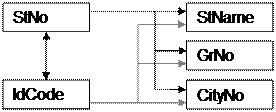 В этом отношении детерминанты являются потенциальными ключами, а все стрелки начинаются с потенциальных ключей. Рассмотрим отношение, не находящееся в НФБК. Предположим, что информация об идентификационных кодах студентов хранится в отношении Marks. Назовем модифицированное отношение MI {StNo, IdCode, SubjNo, DocNo, Mark} ( рис. 6.7).