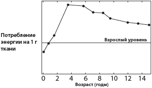 В первые 5 недель после рождения самое высокое энергопотребление наблюдается в соматосенсорной и моторной коре, таламусе, стволе головного мозга и мозжечке, т.е. в наиболее зрелых частях мозга при рождении, которые отвечают за базовые функции жизни, такие как дыхание, движение и осязание. В возрасте 2‑3 месяцев энергопотребление возрастает в височных, лобных и затылочных долях коры головного мозга, а также в подкорковых базальных ганглиях, которые среди прочего контролируют зрение, пространственную ориентацию и движение. В возрасте от 6 до 12 месяцев возрастает потребление энергии в лобных долях коры головного мозга, когда дети впервые начинают контролировать свое поведение. Количество энергии, потребляемой мозгом, продолжает возрастать до 4 лет, а в возрасте около 9 лет начинает снижаться, последовательно достигая «взрослых» уровней в разных участках по мере их созревания. Этот процесс завершается в возрасте от 16 до 18 лет.