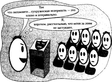 Эволюционная психология помогает нам объяснить человеческое лицемерие в вопросах секса. Распространяя мемы, которые способствуют ограничению половой свободы других людей («супружеская неверность — это очень плохо»), сам «лицемер» не упускает возможности воспользоваться удобным случаем и совершить тот грех, против которого он выступает. ДНК таких лицемеров распространяется быстрее, чем ДНК «честных и порядочных людей». странять те мемы, которые запрещают другим мужчинам вступать в половую связь с их женами. Более того, соблюдение сексуальных норм такого рода заставляет вас действовать в интересах ДНК других людей. Поэтому оптимальная стратегия эгоистичного гена, когда люди еще не обрели сознание и не уяснили себе, что жизнь может сводиться не только к распространению своей ДНК, заключалась в пропаганде этих норм — и вместе с тем в их тайном нарушении — вступлением в половой контакт с чужими женами при малейшей возможности. Так выглядит поведение «лицемеров» в эволюционной перспективе. Вполне возможно, что в будущем двуличие такого рода будет встречаться намного чаще. Дело в том, что в интересах ДНК практически каждого человека одновременно распространять антисексуальные мемы и эгоистично игнорировать их.