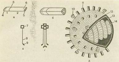 Рис. 43. Строение вириона гриппа (схема). а—мономер гемагглютинина: 1—малая субъединица гемагглютинина; 2— большая субъединица гемагглютинина; 3— место нарезания гемагглютинина-. предшественника; 4— С-конец малой гемагглютинирующей субъединицы, погруженный в липиды; 5— N-конец большой гемагглютинирующей субъединицы, взаимодействующий с рецепторами клетки; б— антигенная детерминанта; 6 — тример гемагглютинина; в — мономер нейраминидазы; 7— гидрофильный участок нейраминидазы; 8 — стержень нейраминидазы; 9 — гидрофобный участок нейраминидазы; г — тетрамер нейраминидазы; 10 — нейраминидаза в составе вириона; 11—гемагглютинин в составе вириона; 12—липидный бислой наружной оболочки вириона; 13 — слой матриксного белка; 14 — рибонуклеопротеид.