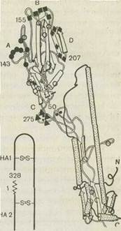 Рис. 44. Гемагглютинин вируса гриппа. а — тример с четырьмя антигенными детерминантами (черные квадратики^ и участком взаимодействия с клеточным рецептором (белый квадратик — рецепторный карман); б — структура мономера по данным рентгеноструктур-ного анализа. Цифры обозначают порядковый номер аминокислот, кружки, квадраты и треугольники—4 антигенные детерминанты (А, В, С и D), 1—' место нарезания предшественника (N-конец. малой субъединицы), S-S-дисуль" фидные связи. меняются незначительно, но при продолжительном периоде циркуляции вируса под влиянием коллективного иммунитета селекционируются варианты, значительно отличающиеся по антигенным свойствам от прототипного штамма. Шифт возникает в результате полной смены гена и обусловлен их пересортировкой при одновременной репродукции в клетке двух вирусов гриппа. Вирус агглютинирует эритроциты кур, морских свинок, человека и многих других видов животных. При низких значениях рН (5,0—5,5) вирус вызывает гемолиз эритроцитов. Нейраминидаза является ферментом, катализирующим отщепление сиаловой кислоты от субстрата. Мономер нейраминидазы под электронным микроскопом имеет вид барабанной палочки и состоит из головки, обращенной кнаружи, размером 4Х4Х4 нм и ножки длиной 10 нм. Соединение двух мономеров происходит за счет дисуль-фидных связей, а двух димеров в тетрамере — за счет межмолекулярных связей. Активные центры и антигенные детерминанты находятся на головках мономеров. Нейраминидаза может изменяться независимо от гемагглютинина, в основе антигенной изменчивости также лежат процессы дрейфа и шифта. Антитела против нейраминидазы не оказывают такого защитного действия, как антитела против гемагглютинина, однако, они частично нейтрализуют вирус и ослабляют инфекционный процесс. Нуклеопротеид (NP) — основной внутренний белок вируса, формирующий субъединицы капсида. Он интимно связан с геномом в течение всего периода репродукции вируса, но не препятствует экспрессии генома. Этот белок является типоспецифическим антигеном, общим для всех вирусов типа А. Антитела к NP не оказывают защитного действия и применяются с целью диагностики инфекции. Матриксный белок — самый низкомолекулярный белок в составе вириона, локализованный на внутренней поверхности липопротеидной мембраны вируса. m|-белок играет роль медиатора при сборке вирусной частицы. Mi-белок является стабилизирующим фактором, при его отсутствии или уменьшении концентрации вирусная частица становится хрупкой и быстро распадается. Матриксный белок, как и NP, является типоспецифическим антигеном, общим для всех вирусов типа А. Белок М2, который кодируется тем же седьмым геном, является неструктурным и локализован в клеточной оболочке. Белки ns] и NSz — неструктурные вирусные белки, которые хотя и кодируются одним (восьмым) геном, имеют уникальные последовательности аминокислот благодаря трансляции со сдвигом рамки. Белок ns) синтезируется на самых ранних этапах репродукции. В ядре и цитоплазме он накапливается в больших количествах и образует включения. Чувствительность к физическим и химическим факторам. Вирус гриппа относительно стабилен и может сохраняться при температуре 4° С в течение недели. Инфекционная активность сохраняется продолжительное время при хранении при температуре —70° С. Прогревание при темпера