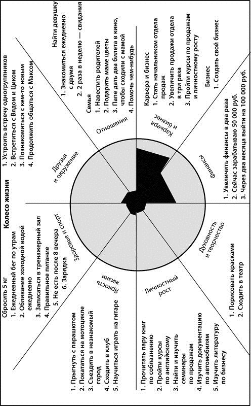 Вопросов к Максу за первый день новой жизни накопилась куча. Вроде кое‑что очень даже получалось, особенно с продажами. Но того, что не получилось или прошло совсем не так, как я хотел, было гораздо больше. В общем, «полосатый» вышел день. Начали с Колеса жизни. Я показал рисунок и в общих чертах объяснил, как и какие сферы планирую развивать в течение ближайших двух месяцев. И не без гордости сообщил, что мне наконец‑то удалось немного структурировать свою жизнь. После этого задал вопрос, который больше всего волновал меня еще со вчерашнего дня: – Макс, вот я все распланировал по разным сферам жизни. Так красиво получается – загляденье прямо. Одно удовольствие видеть себя в будущем, когда я все это реализую. Только вот один нюанс – как же теперь это все можно успеть сделать?