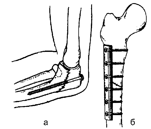 Рис. 11-12. Экстрамедуллярный остеосинтез: а - шурупом при переломе локтевого отростка; б - металлической пластиной при переломе бедра Для осуществления интрамедуллярного (внутрикостного) остеосинтеза используют металлические спицы и стержни (штифты) различных конструкций. Этот вид остеосинтеза обеспечивает стабильное положение отломков. На рис. 11-11 представлена схема остеосинтеза бедра металлическим стержнем. Для экстрамедуллярного (накостного) остеосинтеза применяют проволочные швы, пластинки с шурупами или болтами и многие другие конструкции. На рис. 11-12 представлен остеосинтез шурупом и пластиной. В последнее время для изготовления металлоконструкций стали применять сплавы никеля и титана, в том числе обладающие свойством «запоминания» первоначальной формы - так называемые металлоконструкции с памятью формы. Металлические конструкции, которые, по своей сути, являются чужеродным телом, неизбежно приводят к нарушениям микроцир- куляции и обменных процессов в окружающих тканях, поэтому их целесообразно удалять после окончания выполнения ими своей функции, т.е. после сращения перелома. Обычно эти операции производят через 6-12 мес. В ряде случаев от удаления металлоконструкций приходится отказываться, особенно у пожилых пациентов, у которых имеется высокая степень операционного риска. При эпифизарных внутрисуставных переломах для сохранения функций конечности в последние десятилетия широкое распростра- нение получил метод эндопротезирования суставов. Это, в первую очередь, касается медиальных переломов шейки бедра у пожилых пациентов, у которых первостепенное значение имеет ранняя активизация, являющаяся основным средством профилактики пролежней, гипостатических пневмоний, тромбозов, эмболий и пр. Эндопротезирование тазобедренного сустава позволяет активизировать таких больных практически сразу после операции и через 3-4 нед нагружать конечность. Это, по существу, спасает их от смерти вследствие развития тяжёлых осложнений. Показания Показания к оперативному лечению делят на абсолютные и относительные. Абсолютные показания к оперативному лечению возникают тогда, когда при других способах лечения сращения перелома добиться невозможно либо когда операция является единственным способом лечения в связи с характером повреждений. • Открытые переломы. • Повреждение отломками костей магистральных сосудов (нервов) или внутренних органов головы, позвоночника, груди, живота, таза. • Интерпозиция мягких тканей - наличие между отломками мягких тканей (связки, сухожилия, мышцы). • Формирование ложного сустава - образование замыкательной пластинки, препятствующей сращению костных отломков. • Неправильно сросшиеся переломы с грубым нарушением функций. Относительные показания к оперативному лечению - повреждения, при которых сращения перелома можно добиться различными методами, но остеосинтез даёт наилучшие результаты. • Неудачные попытки закрытой репозиции. • Поперечные переломы длинных костей (плеча или бедра), когда правильное удержание отломков в мышечном массиве весьма проблематично. • Переломы шейки бедра, особенно медиальные (линия перелома проходит медиальнее linea intertrochanterica), при которых нарушается кровоснабжение головки бедренной кости. • Нестабильные переломы позвонков (опасность повреждени