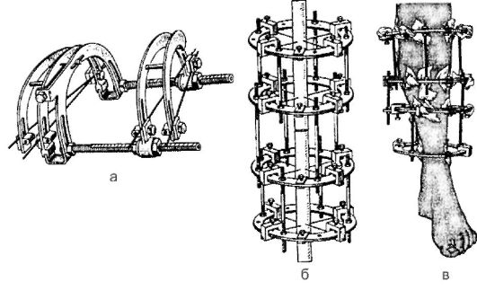 Рис. 11-13. Внеочаговый компрессионно-дистракционный остеосинтез: а - аппарат Илизарова; б - аппарат Гудушаури; в - лечение перелома костей в средней трети голени аппаратом Илизарова ускоряет образование костной мозоли. После этого можно осуществлять постепенную их дистракцию, тем самым удлиняя кость. Подобную методику также используют пластические хирурги при необходимости удлинения конечности.