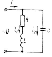 Рассмотрим параллельное соединение емкости С с ветвью, состоящей из индуктивности L и активного сопротивления R (рис. 1-22). Обе ветви находятся под одним и тем же приложенным напряжением и.