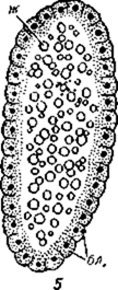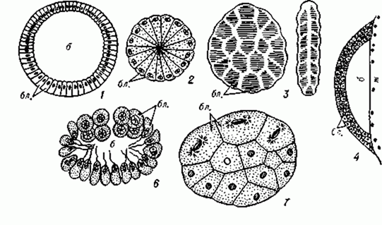 Различные виды дробления: А — полное; Б — частичное; В — дискоидальное. Частичное дробление — тип дробления, при котором цитоплазма яйцеклетки не полностью разделяется на бластомеры. Одним из видов частичного дробления является дискоидальное, при котором дроблению подвергается только лишенный желтка участок цитоплазмы у анимального полюса, где находится ядро. Участок цитоплазмы, подвергшийся дроблению, называетсязародышевым диском. Этот тип дробления характерен для резко телолецитальных яиц с большим количеством желтка (рептилии, птицы, рыбы). Дробление у представителей разных групп животных имеет свои особенности, однако завершается оно образованием близкой по строению структуры — бластулы. Дробление у человека, как и всех млекопитающих, полное, равномерное и асинхронное. Типы бластул: 1 — целобластула; 2 — стерробластула; 3 — плакула (справа — вид сбоку); 4 — дискобластула; 5 — перибластула; 6 — стомобластула; 7 — морула; бл. — бластомеры; ж — желток; б — бластоцель.