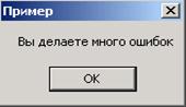Кроме перечисленных функций объект Applications позволяет вызвать более 400 встроенных функций рабочего листа при помощи конструкции вида Application.Функция Рабочего Листа(Аргументы). Примеры: · Application.Sum(Sheets(“Учет”).Range(“A1:B20”)) – суммируются значения из ячеек диапазона “A1:B20”, расположенного на листе Учет; · Application.CountA(Sheets(“Сотрудники”).Range(“A:A”)) – подсчитывается количество непустых ячеек в столбце А на листе Сотрудники. В VBA имеются две разновидности диалоговых окон: окна сообщений и окна ввода. 1. Окно сообщений – MsgBox – выводит простейшие сообщения для пользователя. Синтаксис: MsgBox “Cообщение”[,тк][,тз][,исф,нр], где тк -тип кнопок в окне, если тк=0, то в окне будет одна кнопка Ок, если тк=1, то в окне будут две кнопки Ок и Отмена; тз – текст заголовка диалогового окна; исф – имя справочного файла, содержащего справочные сведения о данном диалоговом окне; нр – номер раздела справочной системы. Аргументы в квадратных скобках приводить необязательно. Пример: MsgBox”Вы делаете много ошибок”,,”Пример”. Результатом выполнения этой инструкции будет диалоговое окно, показанное на рис.5.