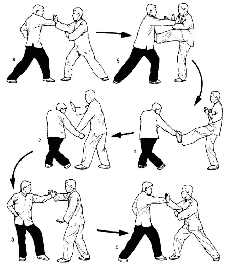Как обычно, X начинает атаку прямым ударом руки, a Y отвечает правой техникой пень (рис. 11.2, а). Само собой разумеется, в реальном бою противники могут начать с других приемов атаки — отражения, но, как правило, поединок начинается именно с этой последовательности. Если соперник начнет атаку ударом ноги (что свидетельствует о его некомпетентности, поскольку удар ногой следует приберегать для особых случаев; в начале атаки такой удар открывает сопернику ваши «слабые точки»), встаньте в «низкую стойку кнута» и, при наличии должного умения, контратакуйте с использованием техник лу и лит (откат назад и давление вперед). Не успев начаться, бой закончится падением противника на землю. Одной из причин однообразного начала разбираемых комбинаций является намерение развить достаточные навыки и довести технику боевых комбинаций до автоматизма. Со временем, когда вы достигнете определенного уровня мастерства, отработка комбинаций станет произвольной, без учета конкретной схемы движений. Тем не менее на начальных стадиях обучения лучше придерживаться двух-трех вариантов ответных действий. Иными словами, на одну и ту же атаку следует отвечать не более чем двумя-тремя приемами. Со временем технику можно будет разнообразить. Постепенное усвоение секретов мастерства является непременным условием на пути к свободным поединкам. Итак, после того как Y отражает первую атаку X, последний левой рукой отводит блокирующую руку противника в сторону, делает шаг вперед стоящей сзади ногой и обеими руками толкает соперника приемом «свирепый тигр толкает гору» (рис. 11.2, б). Первое атакующее движение X было не чем иным, как провокацией; его истинным намерением было не ударить соперника кулаком (локтем), а заставить его выдвинуться вперед, чтобы завалить его назад. Эта ситуация позволяет Y провести удар ногой. Y отводит правую ногу назад, гася инерцию толчка X, разводит его руки и бьет соперника прямым ударом левой ноги. Этот прием является фронтальным вариантом атаки «толкающего удара от скрещенных рук», которая в упрощенном комплексе тай-цзи проводится сбоку. Удар следует наносить в момент кульминации атаки X. Подобная техника еще раз подтверждает принцип «начинать позже, успевать раньше», то есть удар проводится после того, как противник начал атаку, но достигает цели перед ее завершением. X делает «шаг единорога» правой ногой назад и одновременно бьет правым кулаком в голень Y, демонстрируя экзотический шаолиньский прием «темный дракон виляет хвостом» (рис. 11.2, в). Уходя от удара, Y блокирует ударную руку X левой ладонью, а правой наносит противнику удар в голову приемом «понукание лошади» (рис. 11.2, г). X разворачивается на 180° и «продевает нить» левой рукой приемом, известным как «золотой дракон резвится в воде» (рис. 11.2, д). Для предотвращения удара в лицо Y контратакует приемом «зеленый дракон выстреливает жемчужину», отражая атаку одной рукой и отвечая другой. Затем X делает шаг вперед левой ногой и наносит прямой удар кулаком, на который У отвечает «отражающей» техникой (рис. 11.2, е). Таким образом, комбинация заканчивается прямым ударом кулака, отраженным правым блоком, то есть приемами, с которых начинается любая тактическая комбинация. Со временем вы сможете, не прерываясь, переходить от одной комбинации к другой, нарабатывая навыки для свободного поеди