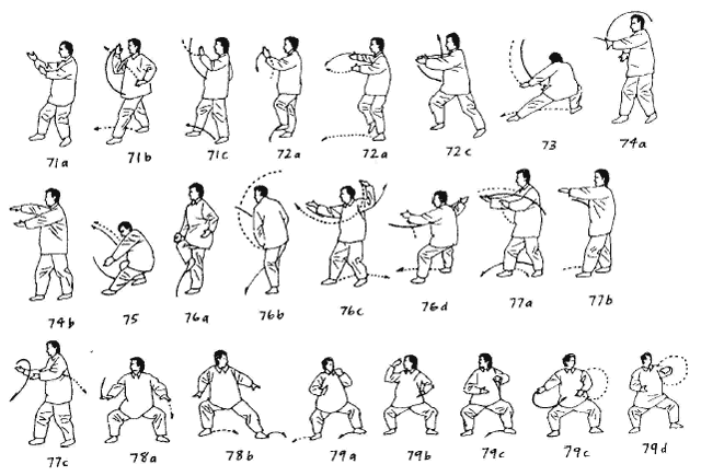 Рис. 13.5. Комплекс тай-цзи цюань стиля вуданг. Набор № 5 71. Темный дракон виляет хвостом. 72. Рой пчел поднимается вверх. 73. Прирученный тигр в низкой стойке. 74. Белая змея выделяет яд. 75. Тысячи тонн давят на землю. 76. Сдерживая лошадь, поднять копье. 77. Семь падающих на землю звезд. 78. Черный медведь поводит плечами. 79. Черный медведь разворачивает лапу. 80. Черный медведь крутит лапой. 81. Золотой петушок отводит крылья. 82. Пустота, воплощенная в единстве. 83. Пчела жужжит над ухом. 84. Лев поворачивается. 85. Сосна устремляется к небу. 86. Возврат в исходное положение.