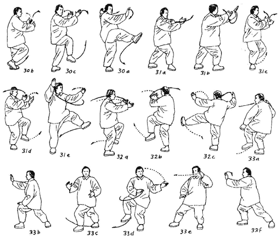 31. Маховый удар левой ногой. 32. Удар ногой с разворота. 33. Поворот колена с ударом (левый и правый).
