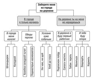 И пишу тебе письмо попросить забрать меня из города домой на деревню. Городские хозяева колотят меня так, что прям смерть. Обижают меня здесь так, что нету никакой возможности. Условия для житья – хуже собачьих. А на деревне я уж буду первый работник. Да и тебе в старости я буду опора. Это и есть принцип дерева в действии: сначала заглавная фраза письма объясняет, с чем мы пришли, затем заглавные фразы абзацев крупными мазками обрисовывают ситуацию, и только потом «рядовые» предложения сообщают детали. Обычно «древовидный» вариант письма нравится группе гораздо больше исходного, но «ремейку», по мнению группы, он все–таки уступает. Чего же этому варианту недостает? Попробуйте, прочитав письмо из раздела про простые деревья, сказать в двух словах, почему Ваньке не место в городе. В двух, скорее всего, не получится. Получится в пяти, но пять – это снова «карась, сова, медведь, щука, крокодил»; слишком много, чтобы удержать в голове. Когда чего–то было слишком много, мы применяли группировку. Двенадцать Ванькиных доводов сгруппировались в пять категорий. Но может быть, и количество категорий удастся сократить? Разделим Ванькины доводы на жалобы и обещания. Теперь причин, по которым Ваньке нужно в деревню, всего две, а на пять категорий они распадаются уже ниже.