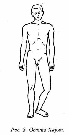Если же туловище согнуто и наклонено, то движения нарушаются, походка становится медленной, неравномерной. Ходьба в таких случаях делается утомительной и даже болезненной. Харли вошел в мой кабинет, явно прихрамывая. Его туловище было наклонено влево, и когда он передвигал левую ногу при ходьбе, то одновременно отодвигал ее кнаружи, описывая кривую. Он работал на своем ранчо в Калифорнии, проводя много времени на воздухе. Примерно год назад Харли выпал из своего грузовичка и ушиб левое колено. Оно опухло и покраснело. Несколько недель он не мог нормально ходить. Рентгеновское исследование показало, что, к счастью, сустав не поврежден. Однако после того, как боль и припухлость прошли, Харли почувствовал, что колено как бы сковано в согнутом положении; он испытывал серьезные неудобства, когда вес тела приходится на левую ногу. Больше всего он жалел, что не может танцевать, как прежде, со своей женой. Я исследовал колено Харли и нашел, что оно двигается свободно. Нога полностью выпрямлялась. Не было никаких внутренних препятствий. При движениях в коленном суставе не был слышен хруст. Не было и растяжения капсулы. Я нажал на колено сбоку. Все было в порядке, за исключением того, что Харли не мог распрямить ногу в колене ни сидя, ни при ходьбе. Я уже понял, что его трудности вызваны нарушением функции, а не каких‑либо структур. Стоя, Харли сильно наклонялся влево. Голова при этом компенсаторно была отклонена вправо. Я спросил, всегда ли у него болезненны мышцы на правой стороне шеи. Он ответил утвердительно. Все мышцы на правой стороне туловища были твердые и напряженные, особенно в области поясницы. Они очень сильно оттягивали его грудную клетку влево, как будто все еще реагировали на падение на колено; именно так оно и было в действительности. Болезненная травма при падении включила в головном мозге рефлекс сокращения мышц на левой стороне. Он сохранялся со времени падения (рис. 8). Этот рефлекс в левом полушарии как бы «заморозился».