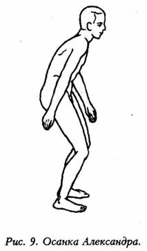 Расположенная на юго‑западе Мексики область Тараскон знаменита своим «танцем старичков». Маленькие старички, в широкополых соломенных шляпах и с длинными белыми бородами, стоят, сильно сутулясь и наклоняясь вперед, опираясь на палки. Они обычно одеты в национальную одежду. В действительности роль старичков исполняют быстроногие молодые люди. Вначале «старички» стоят неподвижно под звуки музыки. Потом, постепенно ускоряя движения, они начинают двигаться всем телом и ногами и в конце танцуют что‑то вроде маленького квик‑степа, очень быстрого. Все это время они сохраняют наклон вперед и опираются на палку. Музыка начинает звучать в ускоренном темпе, и ноги танцоров двигаются с потрясающей скоростью. Жители Тараскона знают миф о старении, и им известен образ старого человека, перемещающегося на «трех ногах». Есть что‑то чарующее в этом действе, особенно в том, что в каждом «старичке» скрыт молодой человек, которого звуки музыки побуждают к радостному танцу. Какая восхитительная перемена происходит со «стариком», который внезапно приобретает гибкость и быстроту движений. Восьмидесятиоднолетний Александр выглядел, как «старичок». Он опирался на палку и был постоянно наклонен вперед, примерно на 50° от вертикали. Сын привел его ко мне, заранее предупредив, что у отца боли в груди и в животе (рис. 9). Он постоянно сутулился с наклоном в 50°, так что когда он спал на спине, то должен был подкладывать три больших подушки под голову. Это — типичное положение старика из загадки Сфинкса. Сын Александра сказал мне, что не ждет, что я смогу исправить осанку отца. Ведь отец слишком стар для этого. Он, однако, надеется, что мне удастся облегчить боли в передней части груди и живота. Александр был бодрым, активным для своего возраста человеком, который не предъявлял никаких жалоб, кроме как на боли в животе и нижней части спины. Он был достаточно хорошо упитан, отличался хорошим аппетитом, сохранял интерес ко многим вещам и во всем остальном был здоров в свои 81 год.