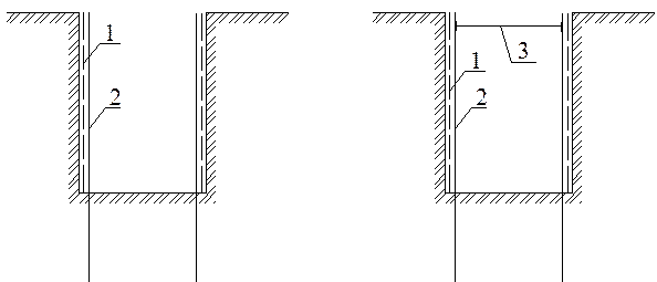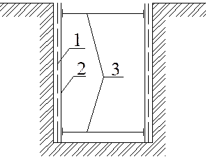 Консольные и консольно-распорные крепления используются при глубинах отрывки 3 м и слабых водонасыщенных грунтах. Конструктивными элементами креплений этого типа являются: металлические стойки – сваи 2, сплошная забирка из досок 1 и распорки между стойками 3.