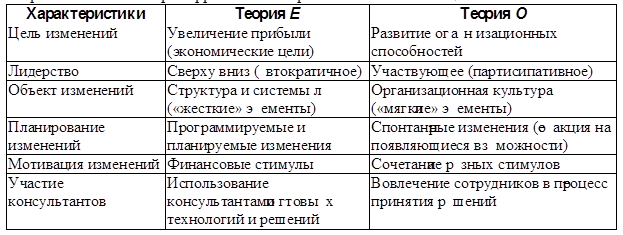 Рис. 3.2. Участие работников в изменениях Теория Е и теория О организационных изменений Помимо моделей организационных изменений, которые предлагают менеджерам конкретную последовательность шагов, эксперты в области организационных изменений разрабатывают подходы к управлению изменениями, описывающие общую философию процесса изменений в организации. В современной литературе по проблеме управления изменениями выделяются две полярные концепции, каждая из которых определяет соответствующую стратегию перемен. Авторами этих концепций, названных, соответственно, теория Е и теория О, являются известные исследователи, профессора Гарвардской школы бизнеса — Майкл Бир и Нитин Нориа. Теория Е исходит из примата финансовых целей и ориентируется на их эффективное достижение, учитывая постоянное давление акционеров компании. Теория О рассматривает организацию как саморазвивающуюся систему и в большей степени ориентирована на корпоративную культуру, цели и мотивы сотрудников организации. Руководители, исповедующие теорию Е, используют, как правило, жесткие методы, делая акцент на осуществление перемен сверху вниз и уделяя основное внимание созданию структуры и систем. Руководители — приверженцы теории О — в большей степени ориентированы на обучение и развитие своих сотрудников, изменения корпоративной культуры и осуществление перемен снизу вверх. В табл. 3.1 представлены характеристики этих двух теорий. Таблица 3.1. Сравнительные характеристики теорий Е и О организационных изменений