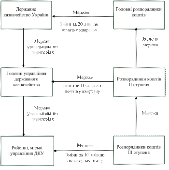 3. Формування мережі розпорядників бюджетних коштів Головні розпорядники бюджетних коштів до початку бюджетного року визначають мережу розпорядників коштів бюджету нижчого рівня та одержувачів бюджетних коштів за територіями та приналежністю до відповідного розпорядника. До мережі розпорядника коштів належать бюджетні установи, що підпорядковані йому за відомчою ознакою або ним координуються, небюджетні установи, які отримують через нього бюджетні кошти (фінансову підтримку) та органи місцевої влади, уповноважені на виконання бюджетних програм. Розпорядники нижчого рівня й одержувачі бюджетних коштів включаються до мережі головних розпорядників (розпорядників вищого рівня), якщо вони отримують асигнування безпосередньо від них. Бюджетні установи в особі їх керівників, уповноважених на отримання асигнувань, прийняття зобов'язань та здійснення виплат з бюджету на виконання функцій самої установи, яку вони очолюють, називаються розпорядниками коштів. Головні розпорядники отримують асигнування з бюджету і розподіляють їх розпорядникам II ступеня, останні, у свою чергу, здійснюють розподіл виділених їм асигнувань розпорядникам III ступеня та безпосередньо підпорядкованим їм одержувачам або одержувачам, діяльність яких координується через них. Не пізніше ніж за 15 днів до початку бюджетного року головні розпорядники подають ДКУ мережу установ та організацій. ДКУ узагальнює цю інформацію та доводить її до своїх територіальних управлінь. ДКУ вносить у свою базу даних про мережу лише інформацію про головного розпорядника. Інформація про мережу розпорядників нижчого рівня та одержувачів бюджетних коштів подасться головними розпорядниками до відповідних управлінь ДКУ. Управління узагальнюють отримані дані, групують за територіями (місто, район) та формують базу даних про мережу установ (див. рис. 7.1).