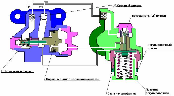 При понижении давления сжатого воздуха в питаемой магистрали ниже уровня отрегулированного при помощи регулировочной пружины, она, преодолевая уменьшившееся усилие сжатого воздуха на стальную диафрагму сверху прогибает ее вверх. Прогнувшись вверх, диафрагма воздействует на хвостовик возбудительного клапана. Клапан перемещается вверх, сжимая возвратную пружину и открывается. Сжатый воздух из возбудительной камеры (следовательно из НМ), через открытый возбудительный клапан, попадает в поршневую камеру. Усилием сжатого воздуха в поршневой камере, поршень, перемещается влево, своим толкателем воздействуя на хвостовик питательного клапана. Питательный клапан открывается, сжимая возвратную пружину сообщая между собой питательную и магистральную камеры. Сжатый воздух из НМ заряжает питаемую магистраль. При повышении давления сжатого воздуха в питаемой магистрали, одновременно давление повышается в диафрагменной камере, и когда оно достигнет регулировочного уровня, стальная диафрагма усилием сжатого воздуха прогнется вниз, сжимая регулировочную пружину. Диафрагма перестанет воздействовать на возбудительный клапан снизу, и он закроется усилием возвратной пружины, разобщив поршневую камеру от возбудительной. Поршень, усилием пружины питательного клапана плавно (так как давление справа и слева от поршня будет уравниваться через калиброванное отверстие диаметром 0,5 мм.) вернется на место. Так же усилием возвратной пружины закроется питательный клапан. Питательная и магистральная камеры перестанут сообщаться и зарядка питаемой магистрали прекратится. Таким образом очевидно, что давление в питаемой магистрали, зависит от регулировки регулировочной пружины в стакане.