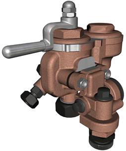 Установлен в кабине машиниста справа и крепится к специальному кронштейну при помощи шпильки. Снизу к крану подходят 2 трубопровода, соединяющиеся с корпусом с помощью накидных гаек. Левый трубопровод соединяется снизу с краном двойной тяги НМ, а правый трубопровод с краном двойной тяги ТМ. Краны двойной тяги размещаются также в кабине под краном машиниста. На лицевую сторону корпуса КМ крепится редуктор ТМ посредством 2-х шпилек через уплотнительную прокладку. На всех промежуточных вагонах КМ находится в переднем отсеке салона вагона (справа от торцевой двери), а краны двойной тяги размещаются под сидением 1-го правого 3-ехместного дивана. При нормальной работе краны двойной тяги на КМ в промежуточном вагоне должны быть перекрыты, а ручка крана должна находиться в первом положении. Рис. Внешний вид КМ №ЗЗ4.