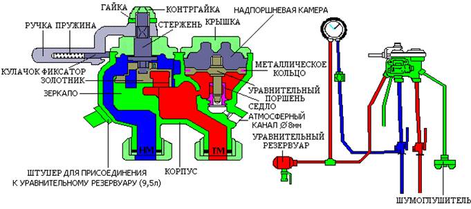 Устройство. В едином корпусе образованы 2 части - золотниковая и уравнительная, закрытые сверху 2-мя резьбовыми крышками