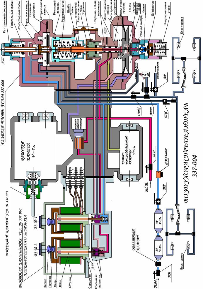 Полный и ступенчатый отпуск тормозаДля полного отпуска тормоза, необходимо зарядить тормозную магистраль при помощи крана машиниста до рабочего давления 5атм. При этом давление сжатого воздуха так же увеличивается в магистральной камере. Когда давление сжатого воздуха в магистральной камере будет больше или равно давлению сжатого воздуха в рабочих камерах, магистральная диафрагма со стержнем с манжетами прогнется вниз (усилием сжатого воздуха и нагрузочной пружины сверху) и займет нейтральное положение. Лишившийся опоры снизу, режимный шток, режимные пружины и режимный поршень, так же переместятся вниз. Режимная диафрагма при этом, усилием сжатого воздуха и нагрузочной пружины сверху прогнется вниз и, как магистральная диафрагма, займет нейтральное положение. Атмосферный клапан откроется и тормозная камера, а следовательно и тормозные цилиндры сообщатся с атмосферой через канал полой трубки и атмосферные отверстия в верхней цокольной крышке ВР. Для ступенчатого отпуска тормоза, необходима зарядка тормозной магистрали ступенями. Первая ступень не менее чем на 0,5атм, а последующие не менее на 0,2атм. При этом ступенчато увеличивается давление сжатого воздуха в магистральной камере главной части ВР. Усилие давления сжатого воздуха на магистральную диафрагму сверху постепенно увеличивается, и она делает частичный ход вниз, ослабляя при этом воздействие режимных пружин (через режимный поршень) на режимную диафрагму снизу. Как только воздействие режимных пружин уменьшится, режимная диафрагма усилием сжатого воздуха и нагрузочной пружины сверху, прогнется вниз, откроется атмосферный клапан и сообщит тормозную камеру и тормозные цилиндры с атмосферой. Разрядка тормозных цилиндров и тормозной камеры будет продолжаться до тех пор, пока воздействие режимных пружин (через режимный поршень), на режимную диафрагму снизу, не преодолеет уменьшившееся усилие сжатого воздуха в тормозной камере, складывающееся с усилием нагрузочной пружины режимной диафрагмы сверху. Режимная диафрагма при этом, частично прогнется вверх, атмосферный клапан закроется, разрядка тормозной камеры и тормозных цилиндров прекратится и наступит положение «перекрыши», но уже с меньшим давлением в тормозных цилиндрах. Следует помнить, что площадь магистральной диафрагмы приблизительно в два раза больше площади режимной диафрагмы. Поэтому, при зарядке ТМ и магистральной камеры на 0,5атм, давление в тормозной камере и в ТЦ уменьшится приблизительно на 0,8 – 1атм и так далее, до полного перемещения всей системы главной части ВР вниз, и возврата магистральной диафрагмы в нейтральное положение..
