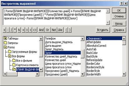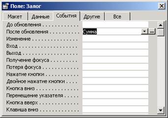 Можно выполнить срабатывание макроса автоматически, связав его с изменением событий, от которых зависит макрос. Для этого надо открыть окно свойств и перейти на вкладку события, щелкнуть в строке свойства того события, при возникновении которого должен запускаться макрос. У нас это Событие – После обновления полей (Залог, Количество дней, Просрочено, Цена проката в сутки) – выполнить макрос Сумма: