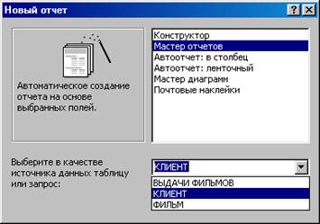 Автоотчет –работает быстрее, чем мастер. Надо указать имя таблицы или запроса и при желании выбрать тип автоотчета – ленточный или в столбец.