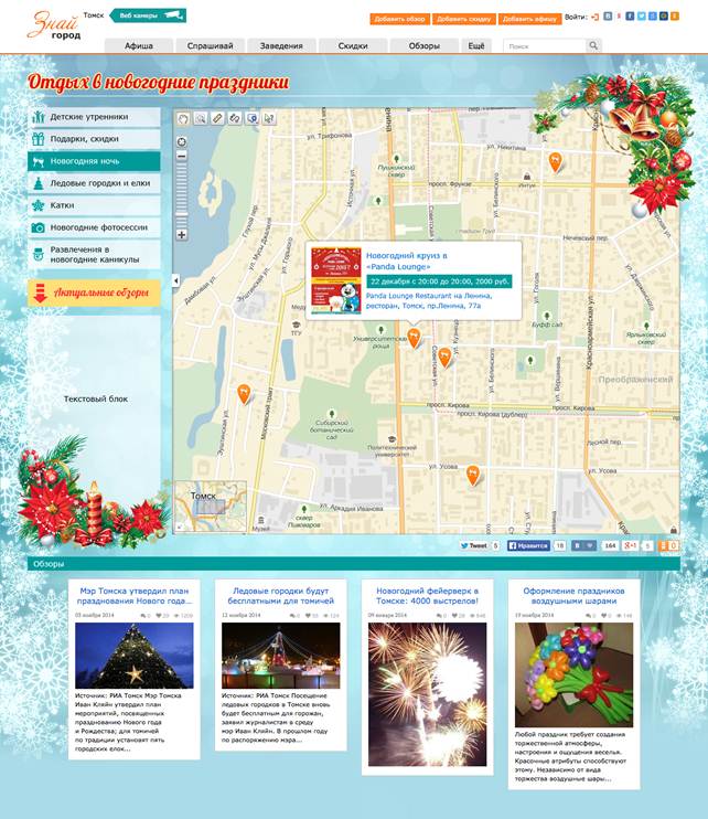 Мы знаем самую главную новогоднюю бизнес-примету: в новый год нужно вступать с новыми клиентами — тогда следующие 365 дней ваш бизнес точно будет процветать! ЗнайГород предлагает широчайшие возможности для привлечения новых клиентов перед праздниками. Каждый год мы открываем специальный новогодний раздел на нашем портале, который пользуется просто бешеной популярностью у пользователей. В этом году мы добавили интерактивную карту и прочие интересности!