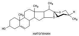 Рисунок 5. Структура нитогенина, вещества, образующего сапонин Кумарины - кислородсодержащие гетероциклические соединения, обладающие антикоагулянтным и фотосенсибилизирующим действием. Известно несколько сот веществ, относящихся к классу кумаринов. Многие вещества растительного происхождения широко используются в медицине, например атропин, галантамин, физостигмин, строфантин, дигитоксин и многие, многие другие. Ряд фитотоксинов вызывают вредные пристрастия и являются излюбленным зельем токсикоманов и наркоманов. Среди них: кокаин, никотин, гармин, морфин, канабиноиды и др. Нередко продукты жизнедеятельности растений являются аллергенами. Отдельные фитотоксины обладают канцерогенной активностью. Например, сафрол и близкие соединения, содержащиеся в черном перце, соланин обнаруживаемый в проросшем картофеле, хиноны и фенолы, широко представленные в многочисленных растениях. Некоторые токсиканты, содержатся в растениях в ничтожных количествах и могут оказывать токсический эффект лишь в форме специально приготовленных препаратов, другие вызывают интоксикацию при поедании растений, содержащих их.
