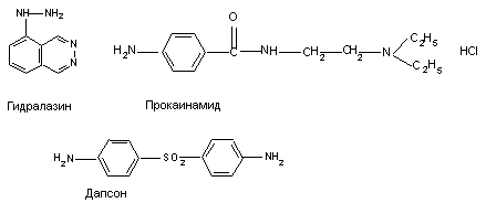Рисунок 1. Структура веществ, вызывающих у чувствительных лиц состояние, напоминающее красную волчанку Примерно у 10% европейцев понижена интенсивность N-окисления спартеина и 4-гидроксилирования дибрезохина. У этих же лиц понижена метаболическая активность в отношении ксенобиотиков с близким химическим строением.