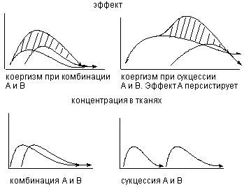 (A.J. Triolo, J.M. Coon, 1966) Для обозначения всех форм эффектов, развивающихся при совместном действии химических веществ, не зависимо от их строения и вида подвергающейся воздействию биологической системы, используют термин - коергизм. Проявления коергизма возможно как вследствие одномоментного (комбинация), так и последовательного (сукцессия) действия веществ на организм (рисунок 1).