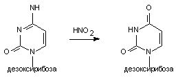 Точечные мутации Минимальным повреждением ДНК является замещение нуклеотида или нуклеотидной пары, называемое точечной мутацией. Если нуклеотид замещается на другой нуклеотид того же типа, например, пуриновое основание на пуриновое основание или пиримидиновое - на пиримидиновое, мутация называется транспозицией. Если пуриновое основание замещается пиримидиновым или наоборот, говорят о трансверсии. При действии химических веществ на организм точечная мутация происходит тремя способами: путем химической модификации нуклеотида, действием на нуклеотиды алкилирующих агентов, включением в цепь ДНК токсиканта - аналога азотистого основания. Примером химической модификации является изменение нуклеотида азотистой кислотой.HNO2 способна превращать цитозин в урацил или аденин в гипоксантин (рисунок 1). Такой тип мутации выявлен в опытах с фагами, бактериями, микромицетами. У млекопитающих он возможен при действии активных в химическом отношении веществ, прежде всего на барьерные ткани (например, эпителий желудочно-кишечного тракта).