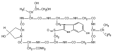 Рисунок 1. Строение Аматоксины являются ингибиторами ядерной РНК-полимеразы В. Угнетая активность фермента, токсины нарушают синтез белка в клетках на этапе транскрипции. Это в свою очередь становится причиной многочисленных биохимических нарушений в пораженных клетках (см. выше), прекращения процесса клеточного деления и некроза клеток. Особенно страдают активно делящиеся клетки, подвергающиеся массивному воздействию токсинов. К числу таких, прежде всего, относятся клетки эпителия желудочно-кишечного тракта, печени и в меньшей степени почек. Развивающиеся при интоксикации патологические изменения включают некроз слизистой кишечника, центролобулярный некроз печени по типу "острой желтой атрофии", некроз эпителия проксимальных отделов канальцев почек. Признаки отравления, как правило, развиваются спустя 6 - 24 часа после потребления грибов. В скрытом периоде происходит проникновение токсина в клетки, взаимодействие его с энзимом и блок синтеза информационной РНК. Первыми симптомами являются тошнота, рвота и профузный холеро-подобный понос, продолжающийся до суток. Если врач обеспечивает поддержание водно-электролитного баланса (введение до 9 литров жидкости в сутки) возможно временное улучшение состояния. Затем появляется желтуха, признаки острой печеночной (а иногда и почечной) недостаточности, развивается кома и смерть на 4 - 7 сутки. В случае несмертельных поражений выздоровление растягивается на три и более недели. Лечение пострадавших симптоматическое. В последнее время показано позитивное влияние на течение интоксикации