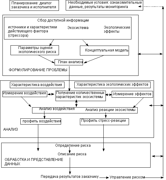 Важнейшей характеристикой ксенобиотиков с позиции экотоксикологии является их экотоксическая опасность. Опасность - это потенциальная способность вещества в конкретных условиях вызывать повреждение биологических систем при попадании в окружающую среду. Потенциальная опасность вещества, определяется его стойкостью в окружающей среде (персистирование), способностью к биоаккумуляции (накопление в организмах животных и растений), величиной токсичности для представителей различных биологических видов. Оценка экологического риска - это процесс определения вероятности развития неблагоприятных эффектов со стороны биогеоценозов (включая популяции человека) в результате изменений различных характеристик среды. Важным элементом оценки экологического риска является выявление опасности, связанной с возможным массивным воздействием на среду различных химических веществ (изменение естественного ксенобиотического профиля среды) и определение вероятности такого воздействия. В системе оценки экологического риска любое воздействие (будь то химический фактор или энергетическое поле), вызывающее изменения в биологических системах (как позитивные, так и негативные), называется стрессором. В этом смысле любой экотоксикант - несомненно стрессор. Как правило оценка экологического риска проводится в форме заказного исследования, выполняемого с целью получения информации, носящей перспективный или ретроспективный характер, и необходимой заказчику (законодательные, управленческие структуры и т.д.) для принятия административных решений. Поэтому, в отличие от научных экотоксикологических исследований, в ходе которых рассматриваются объективные закономерности реакций биоценоза на действие стрессора, при определении экотоксического риска, в качестве объектов среды, подлежащих изучению и УзащитеФ, могут выступать характеристики биосистемы, имеющие антропоцентрическое значение, а порой и отдельные элементы окружающей человека природы, субъективно воспринимаемые общественным мнением, как весьма значимые. Методология оценки экологического риска до конца не разработана. В подавляющем большинстве случаев её выводы носят качественный, описательный характер. Попытки внедрить методы количественной оценки сталкиваются с серьезными трудностями. Это обусловлено сложностью экосистем, комплексностью воздействия на среду стрессоров (не только химической, но и физической и биологический природы), недостаточной изученностью характеристик экотоксической опасности огромного количества ксенобиотиков, используемых человеком и т.д. В этой связи, по мнению самих экологов, в настоящее время оценка экологического риска в значительной степени является искусством. Поскольку процедура оценки риска сложна и в значительной степени страдает известной неопределенностью, с целью стандартизации исследований, Агентство по Защите Окружающей среды США (EPA) разработало и утвердило план проведения таких работ. Он содержит описание последовательности решения задачи, организации и анализа данных, учета неопределенностей и допущений с целью получения в какой-то степени унифицированной приблизительной информации о вероятности развития неблагоприятных экологических эффектов. Согласно этому плану оценка экологического риска включает эта