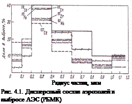 Такие аэрозоли чаще всего появляются в воздухе помещений АЭС при плановых ремонтах и перегрузках топлива. При этих операциях (особенно при различных работах по зачистке, сварке и шлифовке труб) суммарная концентрация аэрозолей, обусловленных активацией, в реакторном помещении достигает 70 - 3000 Бк/м3. Аэрозоли, возникающие при таких работах, крупнодисперсные (6 ¸ 12 мкм), и 60 - 80 % из них задерживаются в верхних дыхательных путях. Типичный состав радиоактивных аэрозолей по активности радионуклидов в выбросе АЭС с РБМК-1000, проработавшей несколько лет представлен в табл. 4.1, а на рис. 4.1. - дисперсный состав аэрозолей в выбросе АЭС с реактором такого же типа. Таблица 4.1 Нуклидный состав аэрозолей выброса АЭС с РБМК-1000, % активности