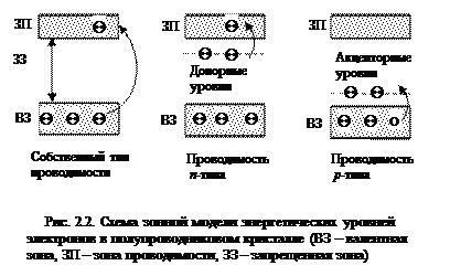Полупроводниковые детекторы (ППД) широко применяются в экспериментальной ядерной физике при регистрации заряженных частиц и g-квантов. Это обусловлено рядом существенных преимуществ, которыми обладают ППД по сравнению с другими детекторами. Эти преимущества следующие. В наиболее распространенных полупроводниках, таких как кремний и германий, энергия, расходуемая на образование носителей информации (заряда) – электронно-дырочной пары – очень небольшая, порядка 3 эВ. В ионизационных камерах на образование пары электрон-положительный ион требуется ~ 30 эВ, а для создания электрона на фотокатоде фотоэлектронного умножителя в сцинтилляционных детекторах нужно затратить ~ 300 эВ. Образование значительно большего числа носителей заряда при поглощении одной и той же энергии уменьшает относительный статистический разброс амплитуд импульсов на выходе детектора, что обусловливает более высокое энергетическое разрешение ППД по сравнению с другими детекторами. Значительно более высокая тормозная способность твердотельных детекторов по сравнению с газонаполненными приборами определяет высокую эффективность регистрации полупроводниковых детекторов, особенно для g-излучения[16]. Полупроводниковые детекторы характеризуются малой длительностью импульса напряжения при регистрации частиц. Это обусловливает временное разрешение порядка нескольких наносекунд, что позволяет регистрировать интенсивные потоки сигналов. Принцип действия полупроводниковых детекторов в некотором смысле аналогичен принципу действия ионизационных камер, только вместо газа между электродами находится твердое вещество, в котором под действием ионизирующего излучения образуются носители заряда. По самому своему названию – полупроводники – это вещества, занимающие в смысле электропроводности промежуточное положение между диэлектриками и проводниками, причем с ростом температуры электропроводность полупроводника быстро увеличивается[17]. Объяснить этот эффект, а также процессы, происходящие в кристаллическом полупроводнике при облучении его ионизирующим излучением, помогает зонная теория твердых тел или, если сказать более строго, квантовая теория состояния энергетических уровней электронов в кристалле. Кратко сущность модели зонной структуры состоит в следующем. В изолированных атомах электроны занимают дискретные энергетические уровни (K, L, M и т.д.). При объединении N атомов в кристалл последний можно трактовать как гигантскую молекулу, в которой электроны всех атомов обобществлены и которую можно рассматривать как единую квантово-механическую систему. В этой системе электроны близкорасположенных энергетических уровней можно объединить в зоны разрешенных состояний. Нижние зоны (довольно узкие) будут целиком заполнены электронами внутренних оболочек атомов. Хотя структура каждой энергетической зоны дискретна, отдельные уровни будут расположены так близко друг к другу, что всю эту область энергий можно рассматривать как практически непрерывную разрешенную энергетическую зону. Промежутки между разрешенными зонами энергетических состояний называют запрещенными зонами. Свойства кристаллов определяются, главным образом, электронами, расположенными в верхних энергетических зонах. Последняя зона разрешенных состояний, запол
