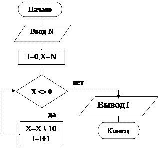 Пояснения к программе: - при очередном выполнении тела цикла число уменьшается на разряд (операцией целочисленного деления); в счетчике I происходит подсчет, сколько таких уменьшений выполнено; - цикл завершается, когда число становится равным нулю (т.е. число «закончилось»).