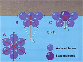 Силы межмолекулярного взаимодействия, действующие на одну из молекул внутри жидкости(точка А на рис.1) со стороны соседних молекул, в среднем взаимно скомпенсированы и равнодействующая сил, действующая на молекулу равна нулю. Молекулы в пограничном слое жидкости, в отличие от молекул в ее глубине, окружены другими молекулами той же жидкости, но не со всех сторон. Молекула B (рис1), находящаяся на поверхности, будет втягиваться внутрь жидкости, поскольку на нее действуют только силы притяжения со стороны молекул, находящихся внутри жидкости (силами, действующими на данную молекулу жидкости со стороны молекул газа (или пара) можно пренебречь. В результате появляется некоторая равнодействующая сила, направленная вглубь жидкости перпендикулярно ее поверхности.
