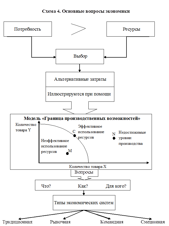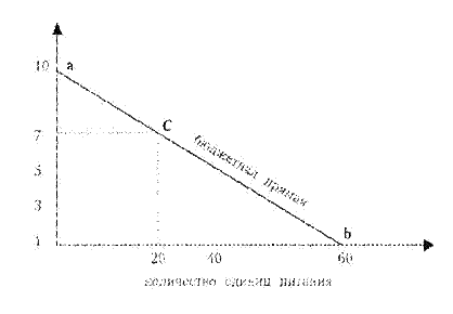 Схема 5. Бюджетная линия и кривые безразличия Потребитель сравнивает разные наборы товаров по степени предпочтительности. Допустим, что некто «Х» выбирает между одеждой и продуктами питания. При этом единица одежды стоит 60 дол. «Х» может купить либо 10 единиц одежды, либо 60 единиц питания, либо то и другое в разном количественном сочетании. На графике все сочетания будут находиться: на прямой линии, соединяющей крайние точки a и b. В точке с, например, может быть куплено 20 ед. питания (200 дол.), таким образом, каждая точка на бюджетной линии показывает, что может приобрести потребитель на свой ограниченный доход, тратя его полностью при условии, что цены на одежду и питание не меняются. Однако нас интересует не сколько то, что может купить потребитель, сколько то, что он пожелает купить при всех введенных ограничениях. Ответ на этот вопрос дают «кривые безразличия». Построить такую можно, выяснив, какие сочетания указанных товаров приносят потребителю одинаковое удовлетворение. Это будет означать, что ему безразлично, какой из этих товаров приобрести.