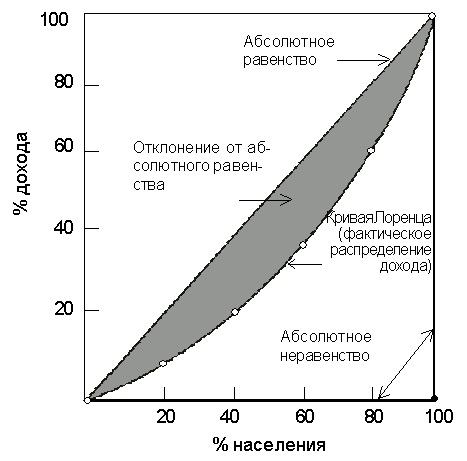 Кривая Лоренца представляет собой промежуточную кривую, причем заштрихованная площадь указывает на отклонение от абсолютного равенства и, следовательно, показывает степень неравенства в распределении дохода. Чем больше эта область, тем больше степень неравенства доходов. Заметим, что государственная налоговая система и трансфертные программы существенно уменьшают степень неравенства в распределении доходов. 1) диагональная прямая (биссектриса) отражает кривую абсолютного равенства; 2) кривая фактического распределения доходов находится между двумя кривыми, представляющими случай абсолютного равенства и абсолютного неравенства; 3) заштрихованная площадь показывает степень неравенства доходов; 4) черные линии, идущие под прямым углом с вершиной в точке f, характеризуют случай абсолютного неравенства. Это когда все, за исключением одного человека (скажем, 99 из 100 человек), не имеют дохода, а этот один человек получает весь доход. Отсюда любое фактическое распределение дохода занимает промежуточное положение между этими крайними случаями. Кривая Лоренца представляет собой промежуточную кривую, причем заштрихованная площадь указывает на отклонение от абсолютного равенства и, следовательно, показывает степень неравенства в распределении дохода. Чем больше эта область, тем больше степень неравенства доходов.