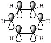 АРОМАТИЧНІ ВУГЛЕВОДНІ Лекція №5 (2 години) 1. Загальна характеристика класу аренів. 2. Будова, ізомерія, номенклатура одноядерних аренів. 3. Природні джерела та способи добування аренів. 4. Фізичні властивості ароматичних вуглеводнів. Ключові слова: ароматичні вуглеводні, одноядерні арени, бензол, ароматичний зв'язок, бензольне ядро, шестиелектронний π-зв’язок, орто-, мета-, пара- ізомери, ароматизація нафти, канцерогенні речовини. Література: [1] с. 75 - 83; [3] с. 185 – 192 1. Загальна характеристика класу аренів Арени – вуглеводні, в молекулах яких міститься циклічне угрупування (бензольне кільце), атоми Карбону якого сполучені між собою ароматичним зв’язком. Найпростішим представником аренів є бензол С6Н6. Класифікація аренів: одноядерні та багатоядерні ароматичні вуглеводні, які мають два або більше бензольних кілець. 2. Будова, ізомерія, номенклатура одноядерних аренів Будова бензолу в світі сучасних уявлень про природу хімічних зв’язків. Сучасна структурна формула бензолу. Молекула бензолу має форму правильного плоского шестикутника. Усі атоми Карбону в бензольному циклі знаходяться в стані sp2-гібридизації. Кожний з них утворює три звичайних σ-зв’язки (за рахунок трьох гібридних орбіталей), які розташовані у просторі під кутом 120о. Негібридизовані р-орбіталі кожного атома Карбону орієнтовані перпендикулярно до площини бензольного кільця і перекриваються між собою над і під кільцем. В результаті виникає спільна електронна хмара і утворюється єдиний хімічний π-зв’язок для всіх атомів Карбону. Таким чином, шість π-електронів не локалізовані в пари, а утворюють єдину π-систему.